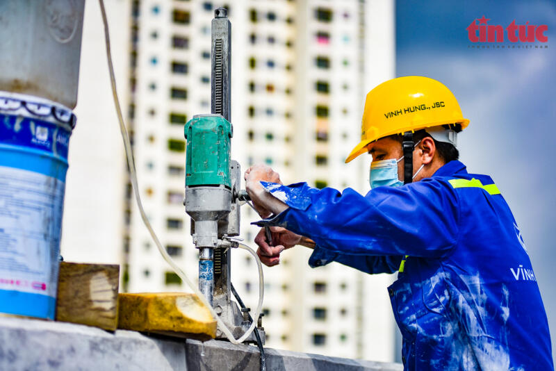 Công nhân khoan bê tông để lắp đặt các cột thép phục vụ việc lắp vách chống ồn.